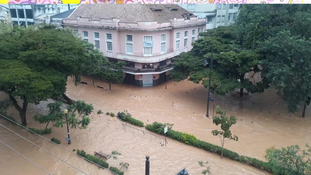Legenda: Temporal fez rio transbordar no Centro da cidade