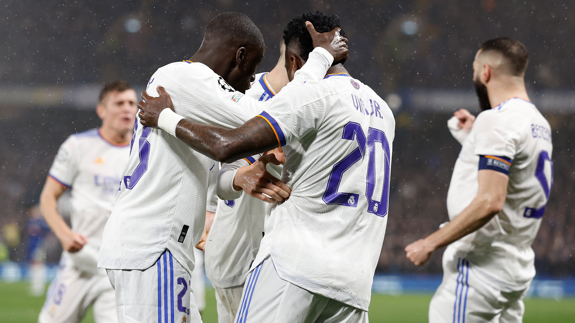 Real faz seu jogo nos contra-ataques Carlo Ancelotti montou o Real Madrid com um atacante a menos e Valverde compondo o lado direito, fechando em uma linha de cinco quando o Chelsea tinha a bola. Deu certo logo aos dez minutos, quando o uruguaio roubou uma bola e iniciou o contra-ataque que Vinícius Jr. finalizaria no travessão de Mendy.