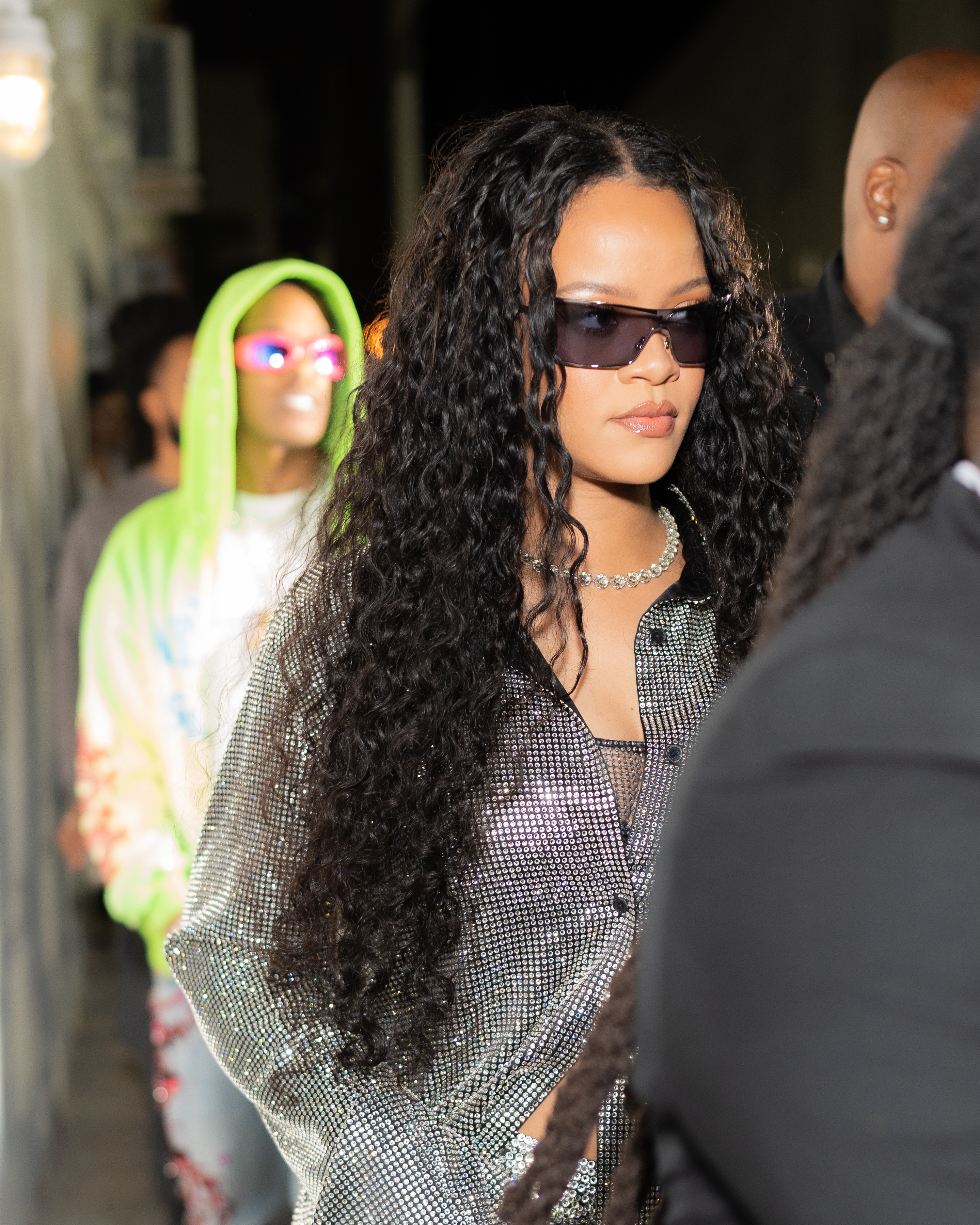 Rih also accessorized with a glittery bag, glittery boxers, and dark sunglasses.
